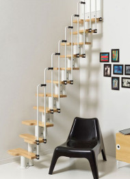 ZIP-I mini scala per soppalco ScaleKit ZIP-I Mini scala per soppalco a 579 IVA e TRASPORTO COMPRESI. Mini scala con struttura in ferro bianco e gradini color noce chiaro.